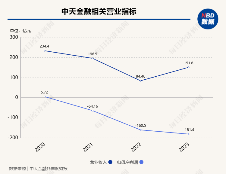 自此之后,中天金融的盈利水平便开始逐年下滑。2021年,随着房地产行业景气度下降,其净利润彻底由正转负,并出现了高达64.16亿元的巨额亏损,债务压力陡增。2022年及2023年,中天金融归母净利润分别达-160.50亿元和-181.44亿元,亏损仍在持续扩大。截至2023年12月31日,中天金融总资产1239亿元,总负债则超过1530亿元,严重资不抵债。